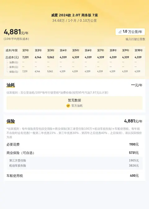 威霆 2024款 2.0T 商务版 7座10年平均用车成本是12579元/年,同级车的最低10是11556元/年,最高是13879元/年,所以它的用车成本合理。