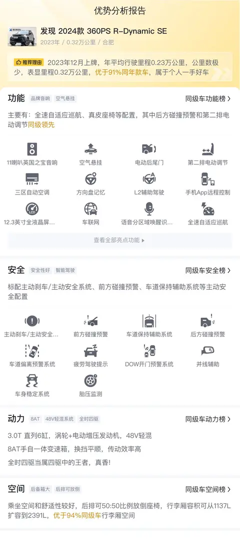 此车具体版本是——发现 2024款 360PS R-Dynamic SE,位于合肥,深灰色车身。2023年12月上牌,行驶了3.2万公里,新车指导价75.88万,二手车报价52.3万,未过户。发现 2024款 360PS R-Dynamic SE 配备了一台3.0T 360马力L6发动机,最大功率为360kW(488马力),最大扭矩为500N·m。传动系统匹配的是8挡手自一体变速箱,驱动方式为全时四驱。NEDC综合油耗为10.7L/100km,官方百公里加速时间为6.5秒。