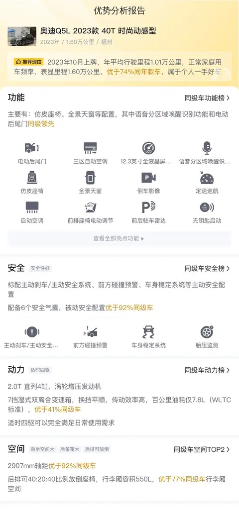 总的来说,奥迪Q5L 2023款 40T 时尚动感型凭借卓越的舒适性、先进的科技配置和合理的油耗表现,是一款颇受用户好评的豪华SUV。其主要的竞争优势在于内饰品质、空间表现和科技配置,而动力表现和品牌认可度则因个人需求和地区差异而有所不同。在选购时,建议根据个人实际情况和偏好做出决策。