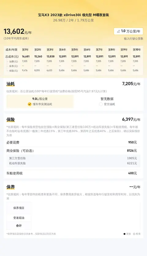 宝马X3 2023款 xDrive30i 领先型 M曜夜套装的10年平均用车成本是14467元/年,同级车的最低是10077元/年,最高是16371元/年,它的用车成本适中。