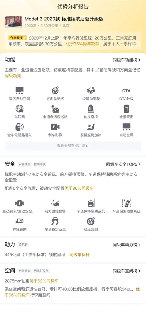 在功能配置方面,该车主要配备了全速自适应巡航、仿皮座椅、方向盘记忆等配置,其中L2辅助驾驶和方向盘记忆在同级别车型中处于领先地位。与同级别竞品车型相比,Model 3在动力、续航里程、驾驶支持技术以及部分舒适性和智能互联配置方面具有较为明显的优势。