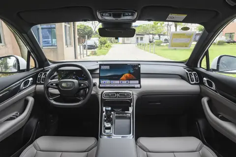 吉利博越L内饰方面中控台上方采用大面积皮质带缝线包裹,往下一块10.2英寸的全液晶仪表搭配皮质包裹的平底式多功能方向盘,中间一块悬浮式15.4英寸的中控大屏,整个内饰的用料厚道且科技感不错。