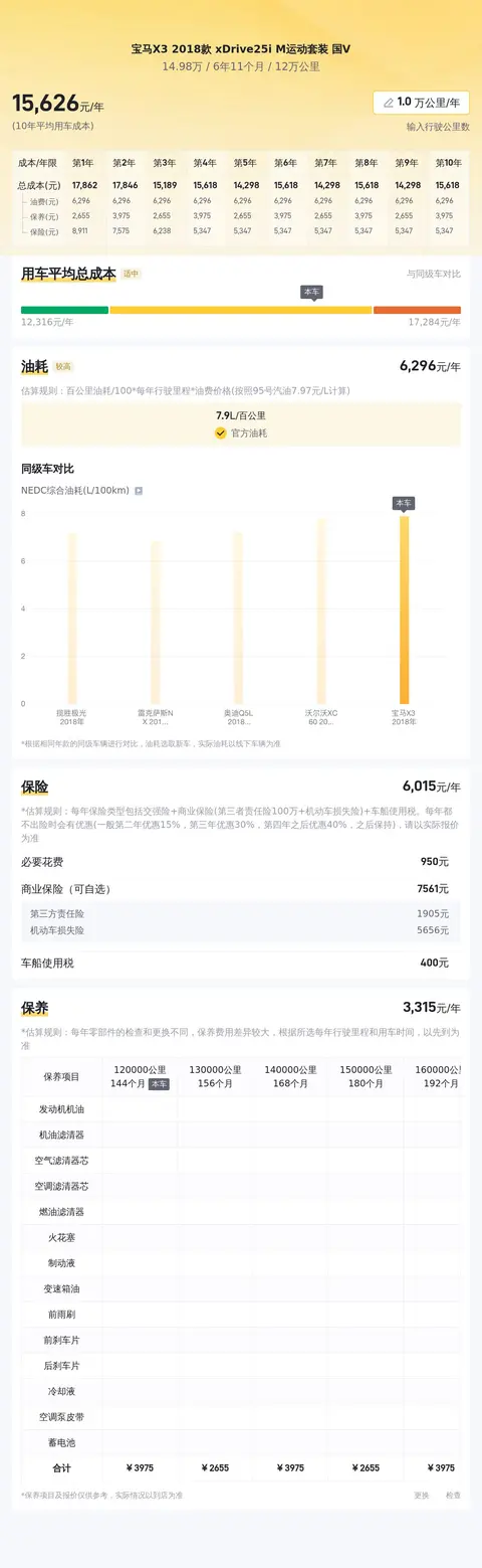 接下来,我们聊聊这款车的用车成本。根据大数据统计结果,宝马X3 2018款 xDrive25i M运动套装这款车型的平均用车成本约为每年1.6万元左右。具体金额还需根据车主的实际使用情况和保养情况而定。影响该车价格的主要因素包括里程数、车龄和过户次数等。车龄越长、里程数越多、过户次数越多,车辆的价格自然也会相应降低。