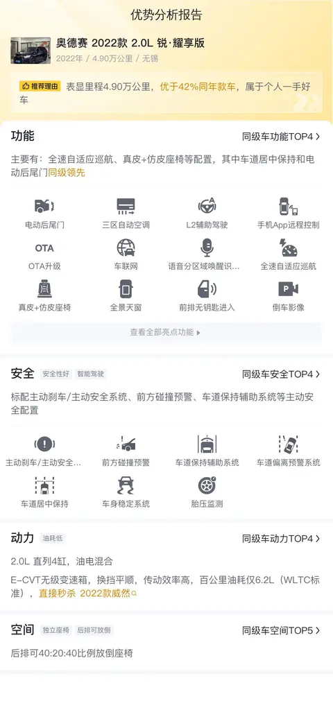 综上所述的新车含税价、用车成本、市场行情、优势分析、同款比价等数据仅供参考。在配置部分,因为二手车非标品,车辆可能会存在配置改装的情况,具体车况信息需要线下结合车辆实际情况进行综合参考。