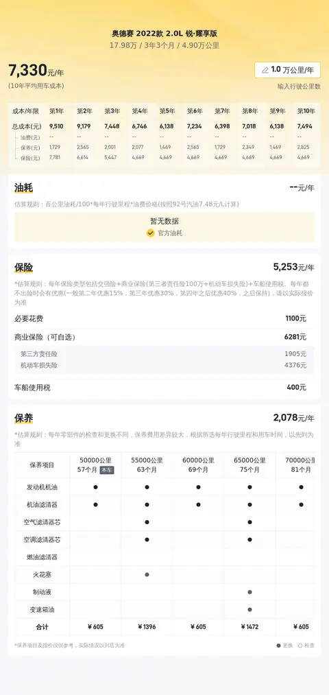 根据大数据统计,奥德赛的二手车行情在17.47万-22.51万之间,而本车报价17.98万,处于相对合理的区间。用车成本方面,这辆车的10年平均用车成本约为11607元/年。