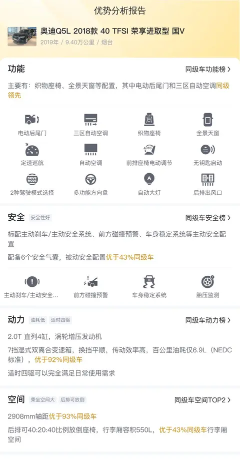 综上所述,奥迪Q5L 2018款 40 TFSI 荣享进取型 国V在动力性能、内饰设计以及安全配置等方面均表现出色。然而,值得注意的是,本车源未提供第三方检测报告,有意者需现场亲自了解车况。
