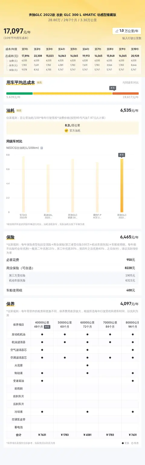这款奔驰GLC 2022款 改款 GLC 300 L 4MATIC 动感型臻藏版的综合性价比指数为72%,这意味着它在同级别车型中具有较高的竞争力和性价比。在做出购买决策之前,您可以参考这个指数来评估这款车是否值得购买。关于用车成本,我们已经提到了这款车的百公里油耗、保险费用和保养费用等信息。根据官方数据和市场反馈,这款车的百公里油耗为8.2升,按照一年两万公里的行驶里程计算,每年的油费约为14966元。保险费用方面,每年约为6738元。保养费用方面,每年约为4046元。这些费用是购买二手车时需要考虑的重要因素之一。
