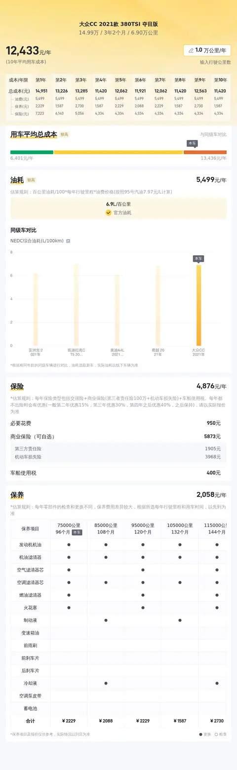 这辆二手大众CC 2021款 380TSI 夺目版的官方百公里油耗为6.9L,按每年行驶一万公里里程计算,燃油费用约为5663元/年,年度商业保险约4681元/年,每年保养费用约1648元/年,平均用车成本约11492元/年,作为一辆定位为中型车的轿车来说,这样的用车成本还是比较友好的。