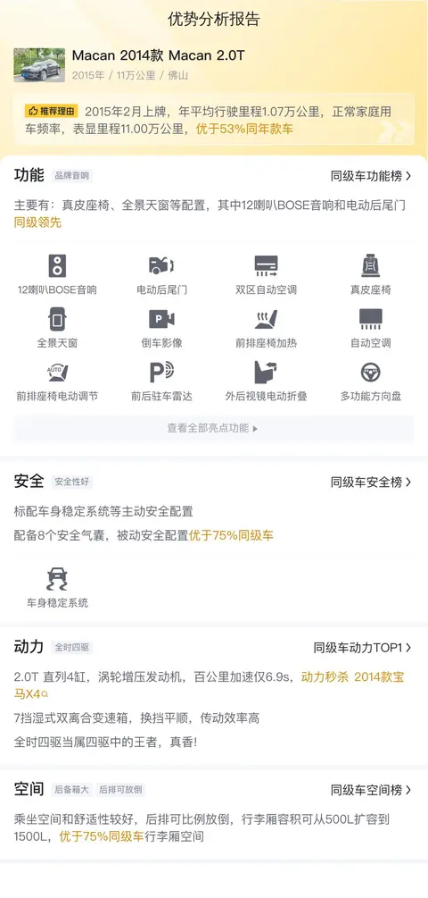 本次介绍的是一款Macan 2014款 Macan 2.0T,上牌日期为2015年2月,上牌地车源地均为佛山,过户次数为1次,表显里程为11万公里,新车指导价为55.8万,目前二手车报价为11.68万,车身颜色为黑色。