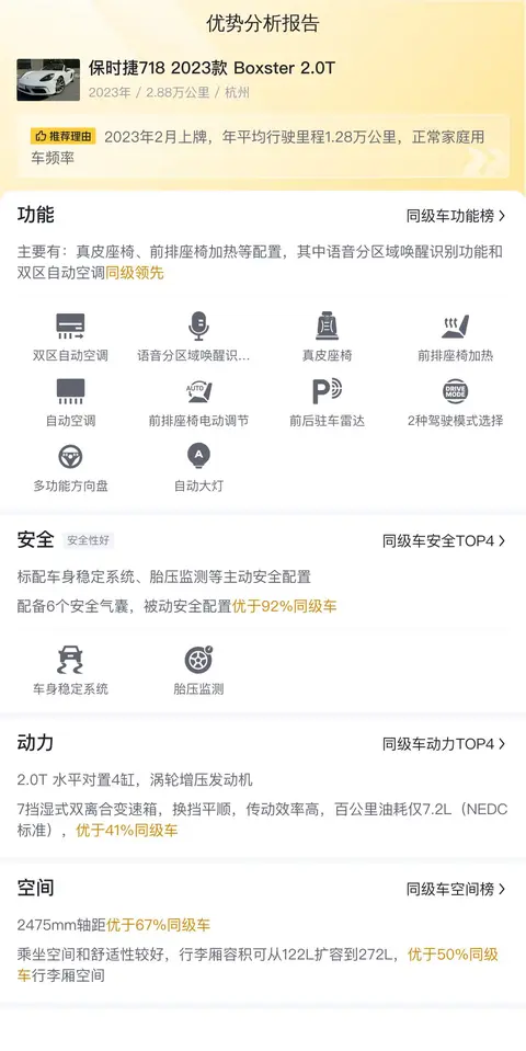这辆二手保时捷718的具体版本是——2023款Boxster 2.0T,新车含税价为63.81万,现在的二手车报价为48万,2023年2月首次上牌,在此期间过户1次。