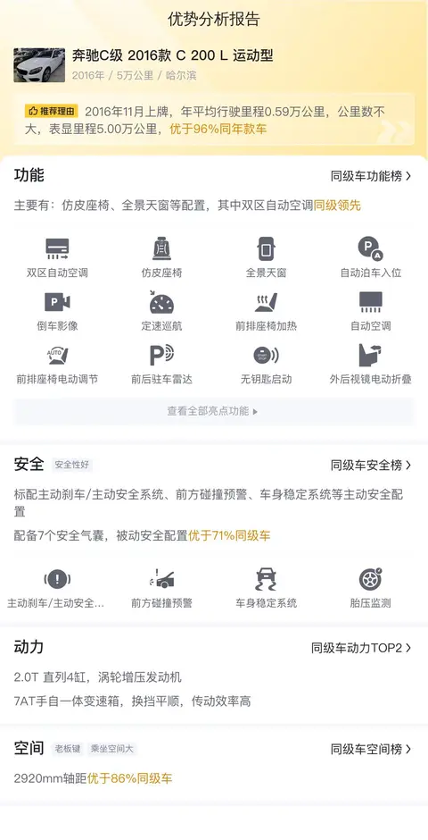 在选择二手车时,车况始终处于买家关注的核心。为此,我们先来了解一下这辆车的基本车况。这辆奔驰C级2016款 C 200 L 运动型行驶里程为5万公里,这一里程数相对较少,意味着车辆的机械部件磨损可能低于平均水平。上牌时间为2016年11月,虽然车龄将近九年,但对于保养得当的豪华车型而言,这一年龄并未达到“高龄”标准。此外,1次过户的经历表明车辆在二手市场上的流转较为简单,有助于追踪车辆历史。