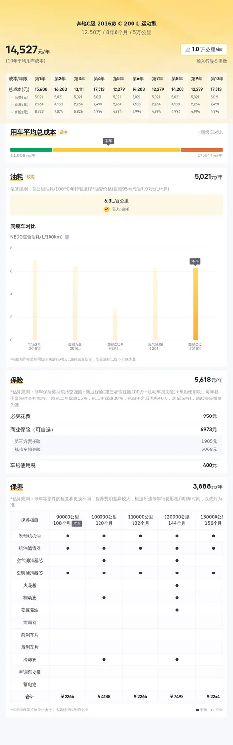 7.优缺点分析:作为一款豪华中型车,奔驰C级2016款 C 200 L运动型在品牌影响力、外观设计、内饰做工等方面都表现出色。同时,其动力性能、舒适配置以及安全配置也都处于同级别车型中的较高水平。然而,作为一款豪华车型,该车的用车成本也相对较高。根据估算,该车6万公里保养总费用大约为16804元,相较于一些同级别车型而言,保养成本较高。