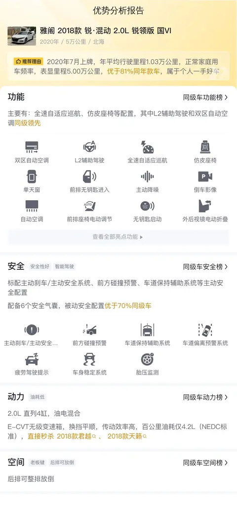 买二手车,配置要实用。雅阁 2018款 锐·混动 2.0L 锐领版 国VI配备了全速自适应巡航、双区自动空调、L2辅助驾驶、前排无钥匙进入和启动等配置。