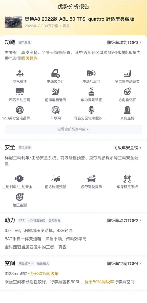 二手车市场鱼龙混杂,单从卖家描述很难判断车况好坏,因此懂车帝针对奥迪A8 2022款 A8L 50 TFSI quattro 舒适型典藏版进行了多项检测,所以它具有完整的全车深度检测报告。