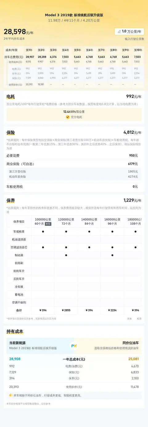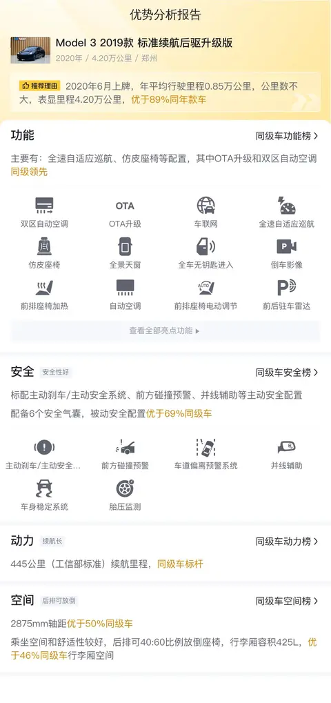 根据大数据分析,这辆Model 3的售价在当前二手车市场中较为合理,预计未来两年内价格相对平稳。选择这辆车,您将节省大笔购车费用。在用车成本方面,Model 3较低的能耗和维护成本,以及特斯拉品牌的可靠性,都将为您节省不少开支。