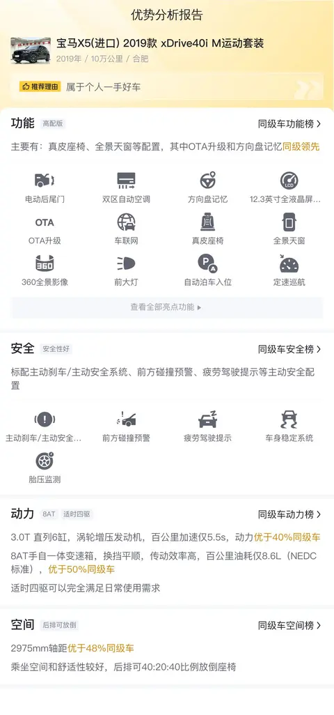 在功能性配置上,宝马X5(进口) 2019款 xDrive40i M运动套装拥有真皮座椅、全景天窗等配置,其中OTA升级和方向盘记忆同级领先。个人认为比较实用的是方向盘记忆功能,因为开车的人员不一样,对方向盘的放置位置也会有差异,有了这个功能,每位驾驶者上车调整好方向盘的角度和位置后,下次再上车,方向盘仍然会保持上次调整好的角度和位置,是一个比较贴心的设计。而在动力部分,这辆宝马X5搭载的3.0T 直列6缸,涡轮增压发动机,能提供强劲的动力输出,百公里加速仅5.5s,优于40%同级车。搭配的8AT手自一体变速箱,不仅换挡平顺,而且传动效率高。同时,该车的适时四驱系统完全能满足日常使用需求。