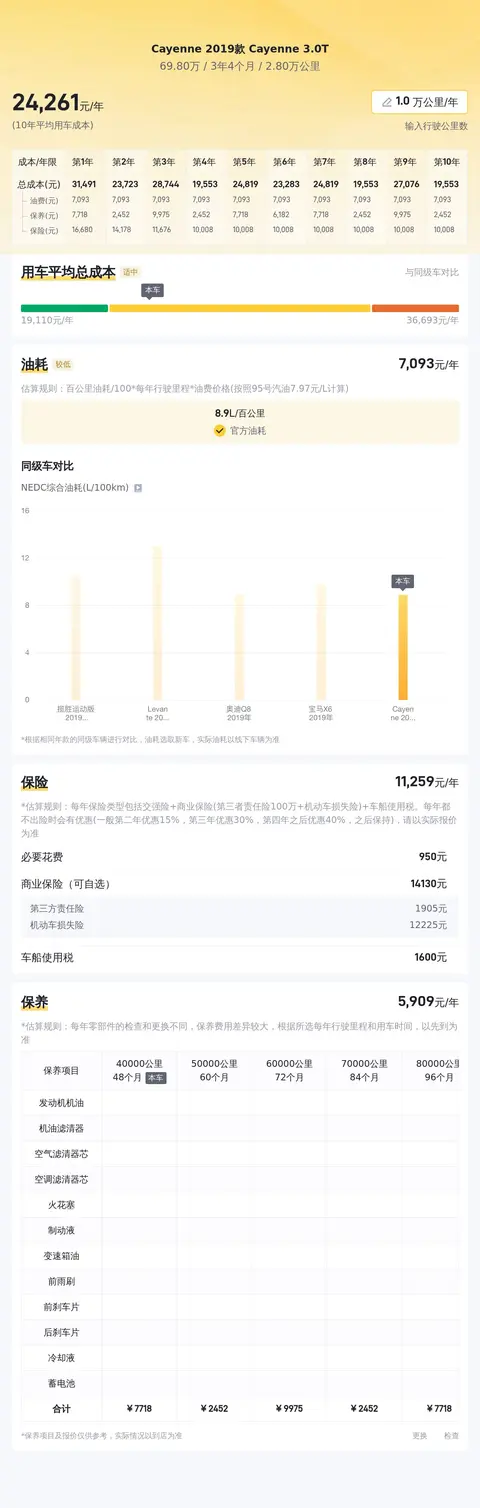 根据懂车帝平台的数据,目前这款二手保时捷Cayenne的市场均价在65.7万至79.7万元之间。具体的售价会受到车辆状况等因素的影响。关于用车成本方面,预估这辆Cayenne的年均综合用车成本约为2.4万元,当然具体金额还需要根据车辆的实际使用情况来决定。