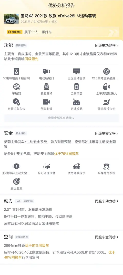 接下来,让我们深入探讨一下这款二手宝马X3的具体情况。这辆2021年款宝马X3 xDrive28i M运动套装,已经行驶了9.1万公里,上牌时间为2021年2月,车牌所在地和车辆所在地均为长沙。该车采用白色外观,符合国六排放标准,至今未有过户记录,是一手车源。