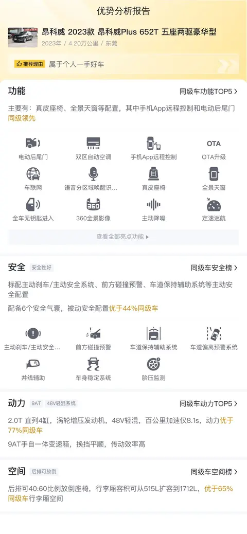 昂科威 2023款 昂科威Plus 652T 五座两驱豪华型的整体配置较好,配备了全速自适应巡航、真皮座椅、车道居中保持、手机无线充电、第二排座椅放倒等配置。安全配置上,标配主动刹车/主动安全系统、前方碰撞预警、车道保持辅助系统、车道偏离预警系统、车身稳定系统等主动安全配置,配备6个安全气囊,被动安全配置优于69%同级车。