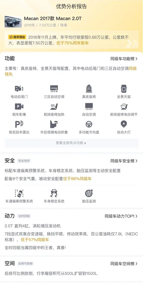 综上所述,这辆二手保时捷Macan在价格、动力、配置等方面还是有很多亮点的,比如价格、百公里加速时间、电动后尾门等,但也有不太理想的地方,比如后排空间、车龄、过户次数等。特别是车龄和过户次数,一方面说明车辆使用时间有点长了,另一方面也说明车辆曾经有过一次交易记录,这方面需要特别关注。按照目前17.8万的报价,预计未来三年内车辆折价不大,从投资保值的角度来看,还是不错的。具体如何选择,还是要看您自己权衡了。