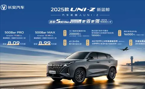 新车采用仪表屏+14.6英寸中控屏组合,提供氛围灯、多功能座椅、无线快充、540度全景影像等配置,搭载千里眼2.0系统。2025款长安UNI-Z搭载最大功率141kW 500Bar超高压直喷1.5T 新蓝鲸发动机 ,匹配7DCT湿式双离合变速器,零百加速7.8秒。2025款UNI-Z PHEV版搭载最大功率72kW 1.5L发动机,匹配综合功率158kW 驱动电机,可提供125公里纯电续航,综合续航可达1200公里。