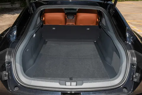 车身侧面是经典的四门轿跑比例,溜背线条从 B 柱开始以 23° 黄金倾角自然下滑,隐藏式门把手和无框车门的搭配,既降低了能耗,又提升了高级感。C 柱独特的 “量子结晶” 切割面设计,在阳光下会像钻石一样折射出光芒。贯穿式的腰线让车身造型更饱满,和隐藏式车门把手搭配,整体感很好。车身尺寸方面,长宽高分别是 4880×1895×1470mm,轴距 2915mm,大小在 Model 3 和汉 EV 之间,既保证了运动的样子,又兼顾了空间实用性。因为轴距有 2915mm,后排膝部空间达到了 945mm,在同级别里很突出,座椅靠背还能 8° 电动调节。储物空间也不错,前备厢有 85L,后备厢标准容积 520L,放倒后排后能扩展到 1450L。