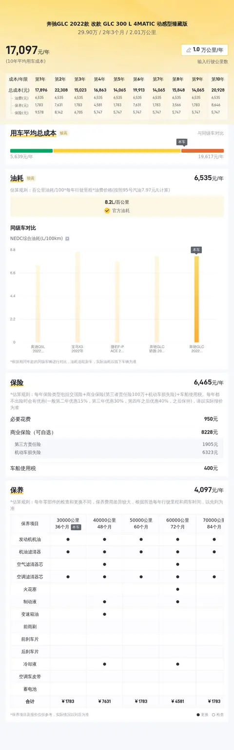 作为一款豪华SUV,奔驰GLC 2022款 改款 GLC 300 L 4MATIC 动感型臻藏版在市场上的表现一直备受瞩目。根据大数据分析显示,这款车在未来三年内的贬值幅度相对较小,保值率约为47.88%,这无疑为购车者提供了一个稳定且经济的选择。而在用车成本方面,按照每年2万公里的行驶里程计算,平均用车成本约为16906元,这一数字相较于同级别车型来说相当合理,为车主节省了不少开支。