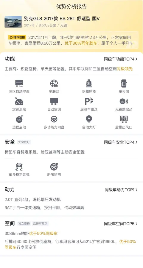 这辆二手别克GL8的具体版本是——2017款ES 28T舒适型,该车首次上牌时间为2017年11月,上牌地为江苏无锡,表显里程8.5万公里,车身颜色为香槟色,个人一手车未过户。这车当时的新车指导价为28.99万,如今二手车报价11.2万。