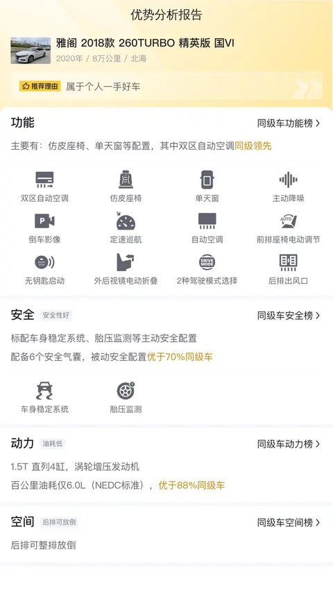 买二手车,它的配置也很重要。这辆车配有仿皮座椅、天窗等配置,其中双区自动空调同级领先。安全性上,这辆车标配车身稳定系统、胎压监测等主动安全配置,配备6个安全气囊。