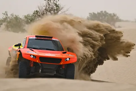当日,2025中国环塔国际拉力赛第九赛段在新疆喀什地区麦盖提县的沙漠中进行。该赛段原定长约210公里,由于当日出现短时沙尘暴并伴有低能见度天气等原因,最终缩减至81公里。