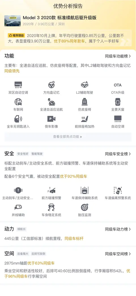 Model 3 2020款 标准续航后驱升级版在多个方面展现出其竞争优势。首先,其纯电动动力系统不仅环保节能,还拥有出色的加速性能。其次,车辆配备了先进的自动驾驶辅助系统,提升了行车安全性与便捷性。此外,Model 3还拥有宽敞的内部空间、丰富的舒适配置以及智能互联功能,为乘客创造了更加舒适的乘坐环境。通过与同级别车型的对比分析,Model 3 2020款 标准续航后驱升级版在各个方面均表现出色,是一款值得推荐的高品质电动汽车。