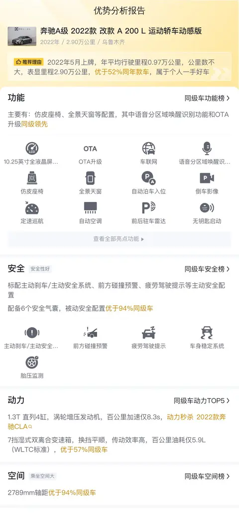 缺点:奔驰A级 2022款 改款 A 200 L 运动轿车动感版用车成本较高,后排空间小,动力弱,购买前需要充分衡量下优缺点,另外实际车况还需要结合实车进一步确认。