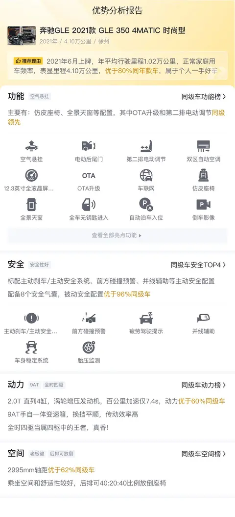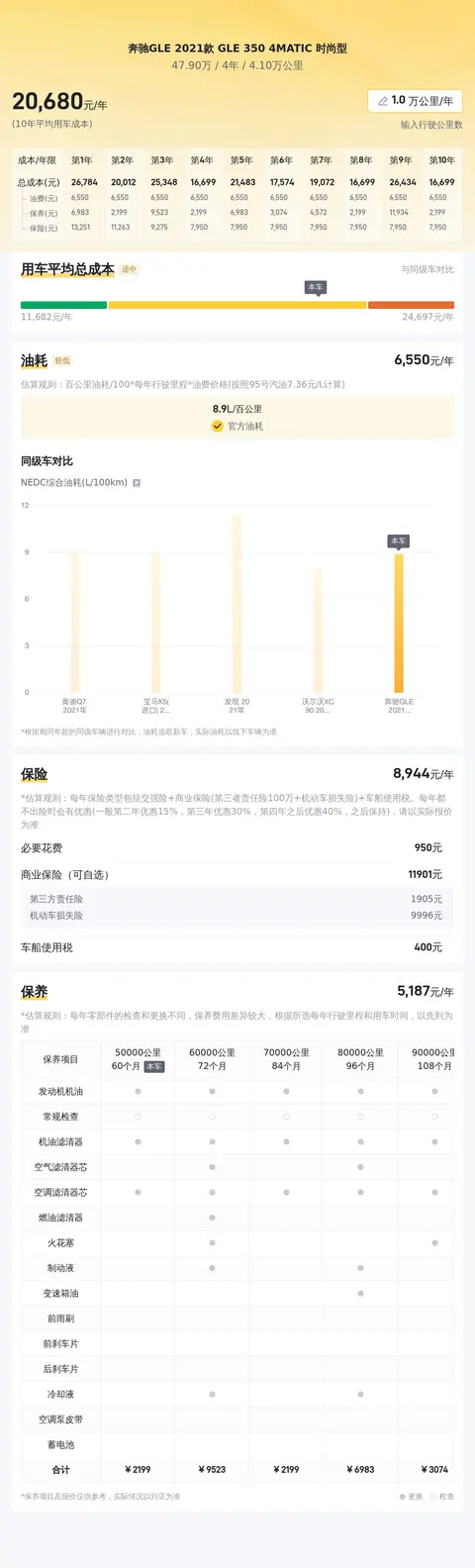 据估算,同级车的最低用车成本是8756元/年,最高是23710元/年,奔驰GLE 2021款 GLE 350 4MATIC 时尚型是20670元/年,所以用车成本不算低。