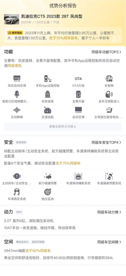 根据懂车帝的数据,这辆凯迪拉克CT5 2023款 28T 风尚型的市场行情价为14.58万 - 17.46万,而该车的报价为14.58万,这意味着其报价在市场中偏低。考虑到车辆的综合情况,这辆车具有较高的性价比。在用车成本方面,如上所述,该车百公里油耗为7.7L,按照当前油价计算,每百公里的油费约为637元。此外,保险费用预计为5278元/年,这些是在选购二手车时需要考虑的长期成本因素。