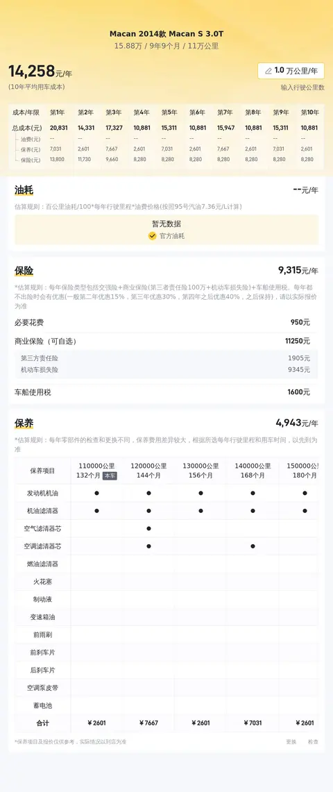 说到用车成本,这个是跟车主的实际使用情况有着直接联系的。通常而言,这款车型的年均综合用车成本大致在每年2.2万元左右。当然,这一数字会随着不同车主的用车习惯、地点以及燃油价格波动等因素而有所变动。为了使您获得更准确的预估费用,我们将综合考虑一系列变量,包括车辆的行驶里程、使用年限以及所在地的消费水平等因素。值得一提的是,车辆保险费用属于一年一结的性质,其具体金额会根据保险公司提供的优惠政策和个人的驾驶记录等情况而有所调整。同样,车辆保养费用也是如此,它会根据车辆的实际使用情况和保养项目的不同而产生差异。