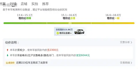 在了解一辆车的整体情况后,让我们来看看影响其价格的具体因素。首先,里程数是衡量车辆使用程度的重要指标,本车里程少于均值0.5万公里,这可能为车辆保值带来约2300元的正面影响。其次,车龄也是影响价格的关键因素,本车车龄多于均值0.2年,在价格评估中可能会因此减少约2100元。再次,过户次数也会对车辆价格产生一定影响,本车过户次数多于均值0.6次,这可能会使车辆价格进一步降低约2500元。最后,车辆的颜色也可能影响其价格,本车颜色为咖啡色,根据市场情况,这可能使车辆价格减少约1444元。需要注意的是,尽管这些因素提供了评估车辆价格的大致方向,但每一辆车的实际情况都独一无二,因此价格评估应始终基于车辆的综合状况。