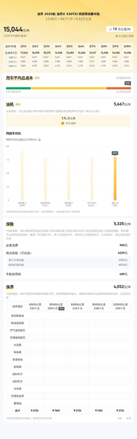 首先,我们来了解一下这辆2020款途昂X 330TSI 两驱尊崇豪华版的基本情况。它的上牌日期为2022年10月,上牌地是贵阳,表显里程为8.43万公里,新车指导价为31.99万,二手车报价为13.68万,过户次数为1次。
