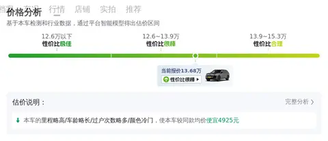结合当前二手车市场行情,这款车的售价在13.18万至16.59万之间。而本车的售价为13.68万,价格合理,同时根据估算,这辆车的年均综合用车成本大概在每年1.5万元左右,当然具体用车成本还是要根据车辆的实际使用情况而定。