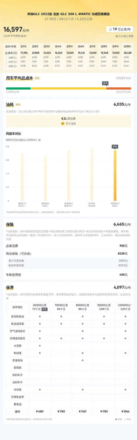 在用车成本方面,这款车的官方百公里油耗为8.2L,根据实际使用情况和用车强度不同,油耗表现也会有所差异。年均保养费约4600元,年均保险费约6700元(具体金额以实际使用情况为准)。