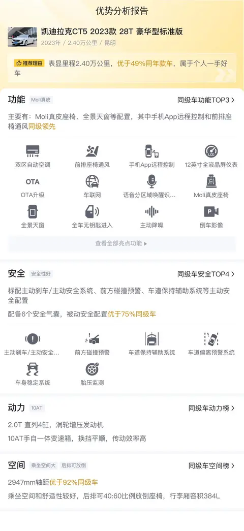 综上所述,这款凯迪拉克CT5 2023款 28T 豪华型标准版在性能、配置、舒适性和安全性等方面都表现出了较高的水准。它的动力强劲且平稳,操控稳定且灵活,舒适性出色且智能互联功能丰富,同时还具备较高的安全性能。所有图片均为实拍图,想了解更多详情可以点击文章底部车源链接。
