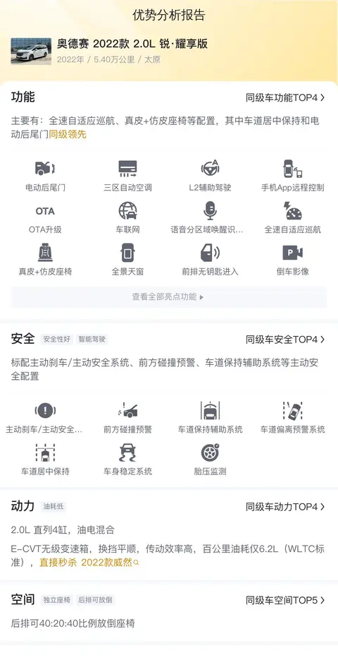 优势方面,这辆奥德赛 2022款 2.0L 锐·耀享版车道居中保持领先于2022款威然,电动后尾门领先于2022款胜达旅行家。其中,车道居中保持这个功能,不仅可以让车辆在高速上自己调整车道位置,不用人为去调整,开起来会更轻松,更安心。