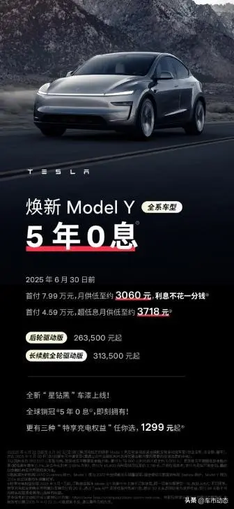 为了回馈消费者,特斯拉针对焕新Model Y和Model 3(图片|配置|询价)推出了一系列极具吸引力的销售政策。焕新Model Y作为特斯拉的明星SUV车型,今年首次推出5年0息特惠,6月30日前,首付7.99万元,月供低至约3060元。