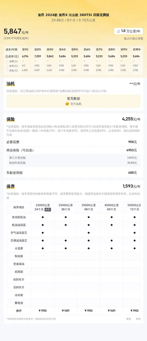 在用车成本方面,按照每年行驶1万公里计算,10年平均用车成本约为每年13682元。这包括油费、保养费、保险费等各项支出。与同级别车型相比,这一成本处于适中的水平。