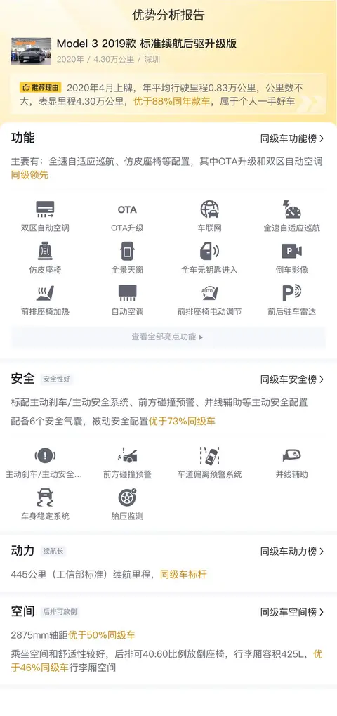 这辆Model 3 2019款 标准续航后驱升级版位于深圳,外观为深灰色,2020年4月在深圳上牌,至今行驶里程仅为4.3万公里,仅使用了原厂电池的一半不到的电。车况良好,从未过户。新车指导价29.18万,现在二手报价12.98万。