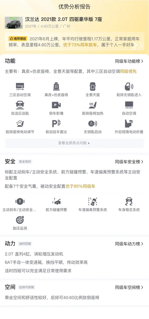综上所述的新车含税价、用车成本、市场行情、优势分析、同款比价等数据仅供参考。在配置部分,因为二手车非标品,车辆可能会存在配置改装的情况,具体车况信息需要线下结合车辆实际情况进行综合参考。