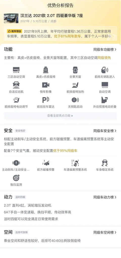综上所述,本车是一辆整体车况不错的汉兰达,空间大,适合全家出行,而且是国VI排放标准,市场保有量大,保值率高。在这个价位下,本车是一个不错的选择。