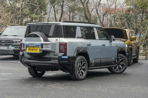 在外观设计上,方程豹豹8沿袭了方盒子造型,整体线条硬朗,极富战斗气息。为了增添未来科技感,新车在细节上设计出了星舰式的视觉效果,霸气而科幻。在车头两侧,还设有隐藏的拖车钩,与大梁连接,兼具实用性和视觉效果。格栅采用半黑色倒梯形设计,搭配方正的头灯,形成较强的冲击力,整体造型粗犷有力,彰显硬派越野车的风格。车身侧面,除了运动感十足的黑色轮眉和裙边装饰之外,豹8还采用了黑化处理的A柱、B柱和尾柱,营造出悬浮式车顶效果,增加了整体的层次感和视觉宽敞感。隐藏式门把手的设计也在侧面得以体现,不仅提升了整车的精致感,同时也增加了侧面的整体协调性。尾部设计则与前脸呼应,线条平直、方正,塑造出硬朗的轮廓。外挂备胎是越野本色的体现,它不仅赋予车辆阳刚气质,也极大地提升了外观的野性魅力,让整车更具硬派越野车的影响力和冲击力。