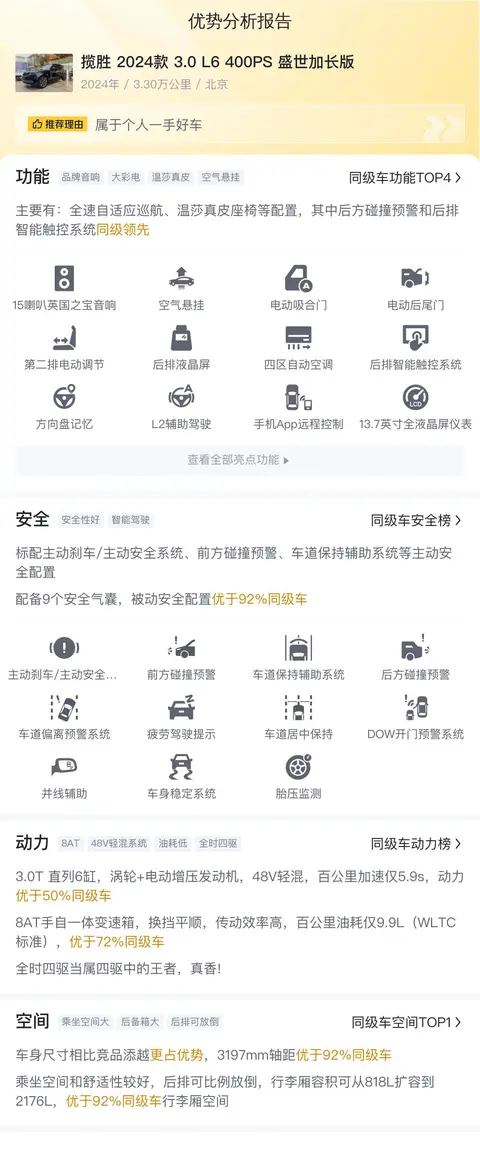 综上所述的新车含税价、用车成本、市场行情、优势分析、同款比价等数据仅供参考。在配置部分,因为二手车非标品,车辆可能会存在配置改装的情况,具体车况信息需要线下结合车辆实际情况进行综合参考。