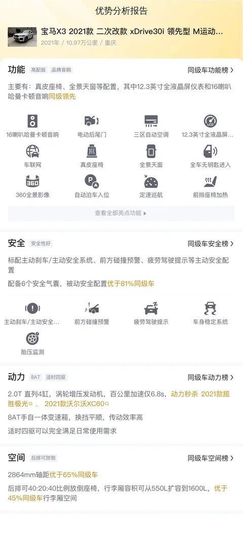 这辆宝马X3搭载2.0T 直列4缸,涡轮增压发动机,百公里加速仅6.8s,动力秒杀2021款揽胜极光、2021款沃尔沃XC60,8AT手自一体变速箱,换挡平顺,传动效率高,适时四驱可以完全满足日常使用需求。
