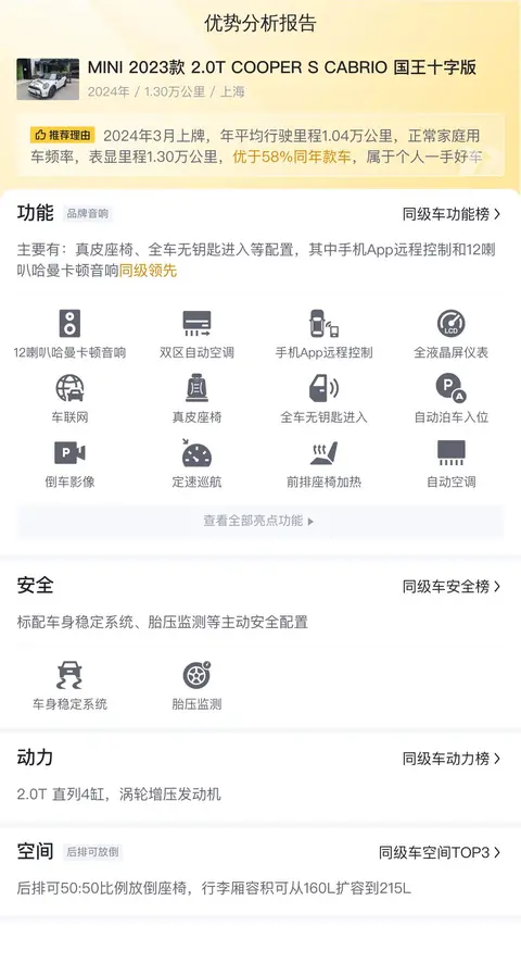 咱们今天要看的这辆二手MINI,是2023款2.0T COOPER S CABRIO国王十字版,首次上牌时间为2024年3月,至今行驶里程为1.3万公里,没有过户记录,一口价29.8万。车源所在地和上牌地均为上海,车身颜色为白色。